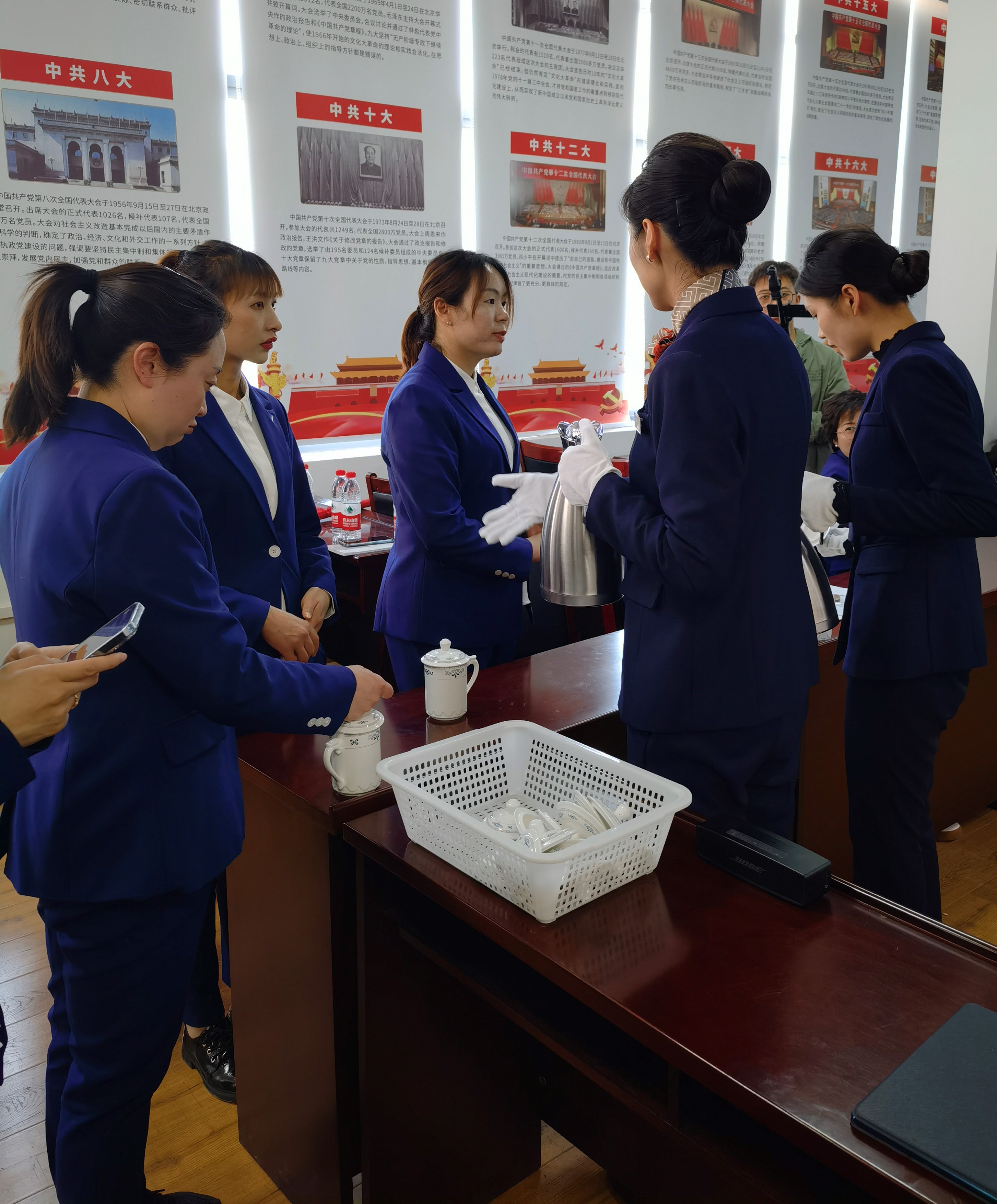 活動中,老師從專業(yè)角度,詳細(xì)講解了站、走、坐、蹲,指引手勢、會務(wù)服務(wù)等不同的禮儀規(guī)范。通過現(xiàn)場問答、上臺參與、互動練習(xí)等方式,職工與培訓(xùn)老師積極互動。培訓(xùn)老師講解深入淺出、通俗易懂,加上形象生動的示范指導(dǎo),現(xiàn)場氛圍活躍、形式多樣。此次培訓(xùn)還著重講授了會務(wù)禮儀服務(wù)知識,參培人員從會場布置、會議材料擺放、會務(wù)人員的站姿、走姿、茶水服務(wù)等方面進行實際操作,互相找不足、補短板、做總結(jié),確保學(xué)有所獲,動作標(biāo)準(zhǔn),服務(wù)規(guī)范。