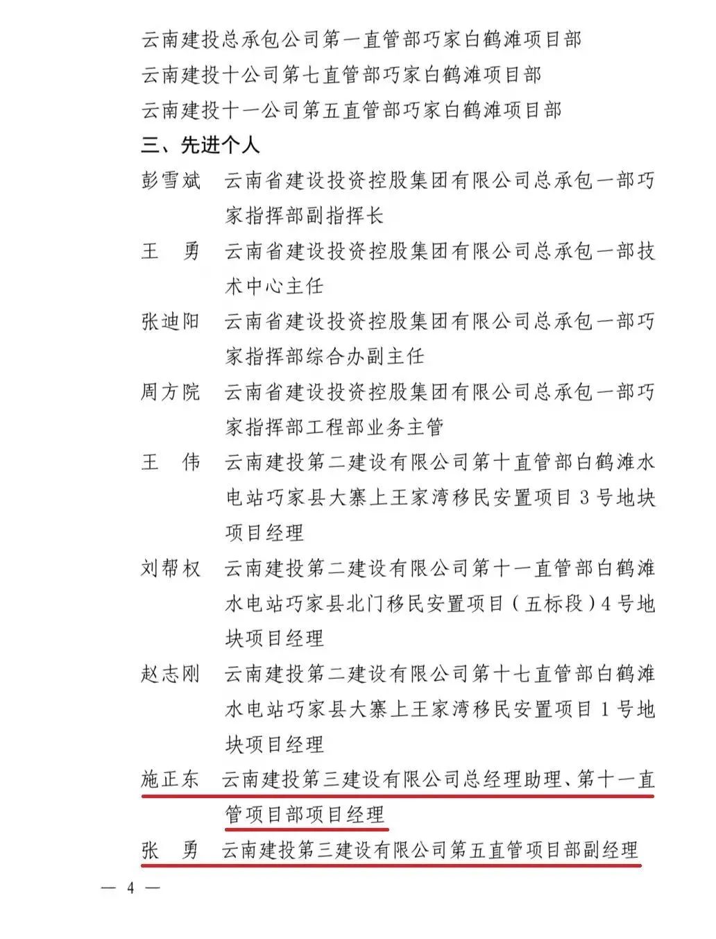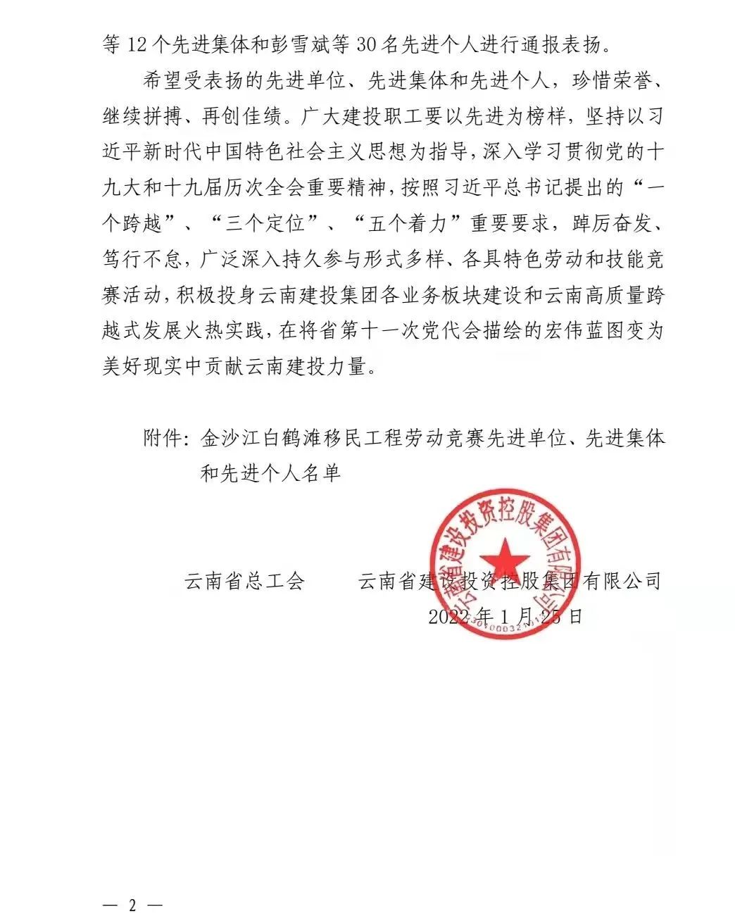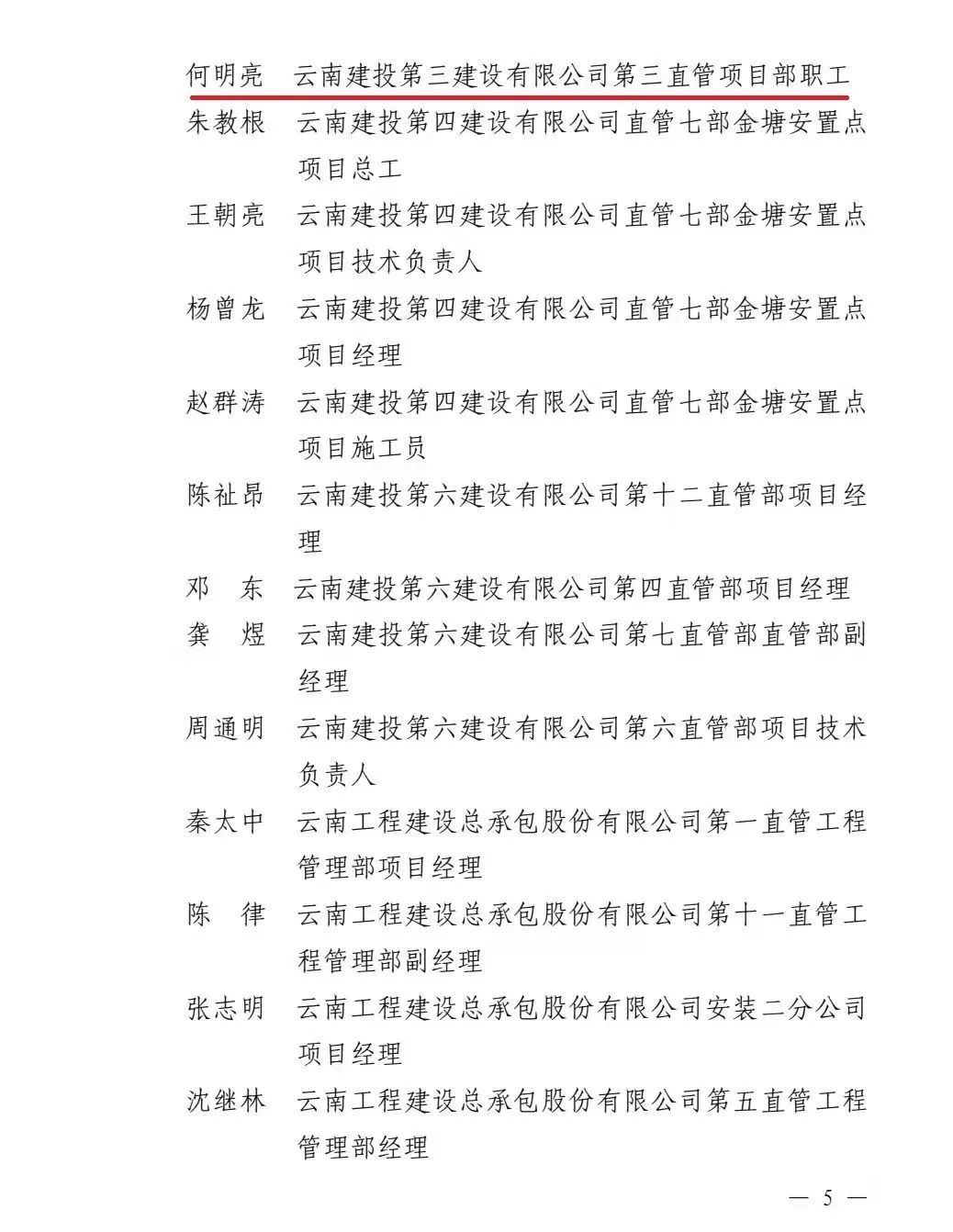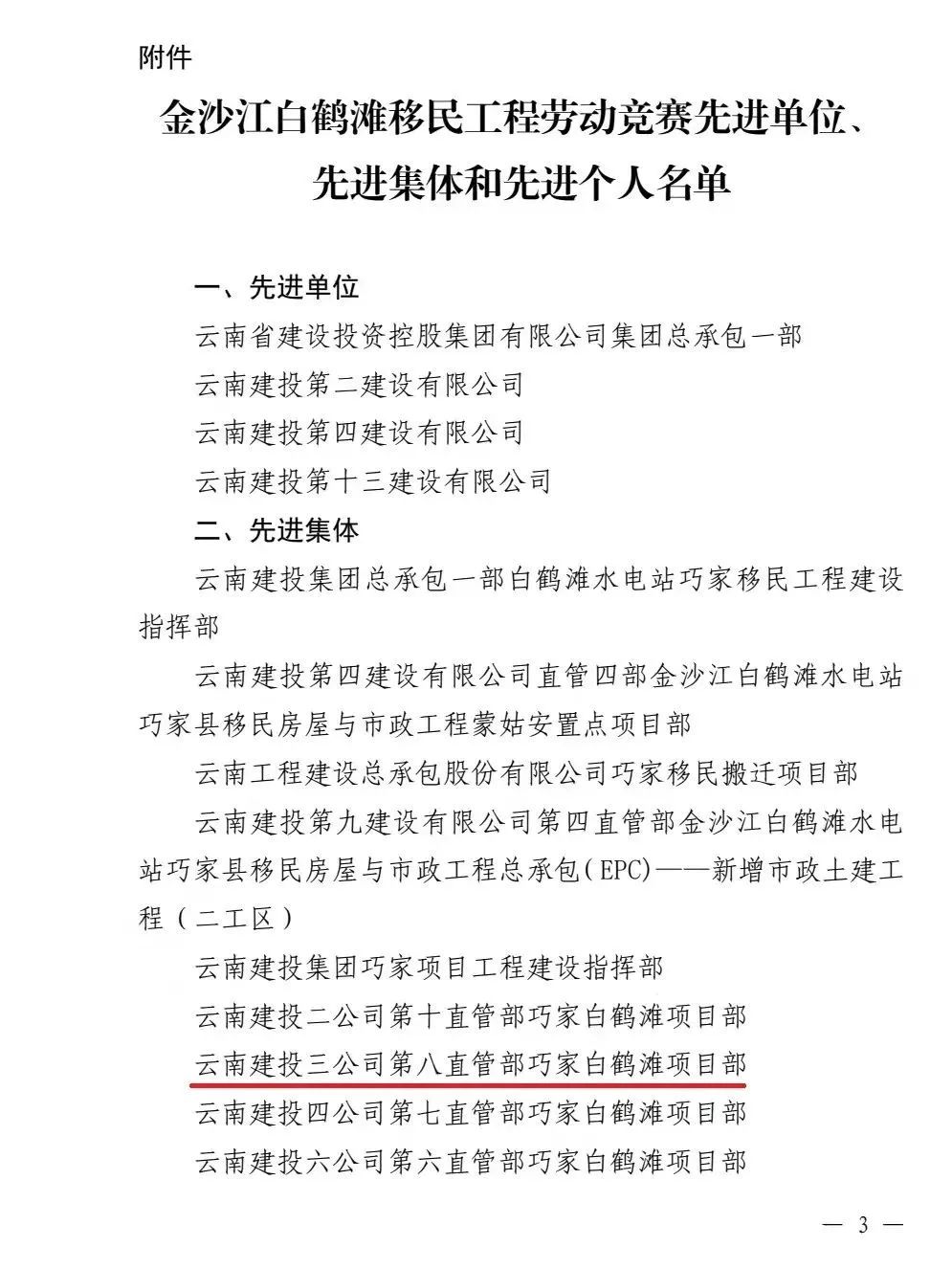 近日,云南省總工會(huì)和云南省建設(shè)投資控股集團(tuán)有限公司聯(lián)合發(fā)文,通報(bào)表揚(yáng)金沙江白鶴灘移民工程勞動(dòng)競(jìng)賽先進(jìn)單位、先進(jìn)集體及先進(jìn)個(gè)人。公司第八直管項(xiàng)目部榮獲先進(jìn)集體,公司總經(jīng)理助理、第十一直管項(xiàng)目部經(jīng)理施正東,第五直管項(xiàng)目部副經(jīng)理張勇以及第三直管項(xiàng)目部項(xiàng)目經(jīng)理何明亮榮獲先進(jìn)個(gè)人。
