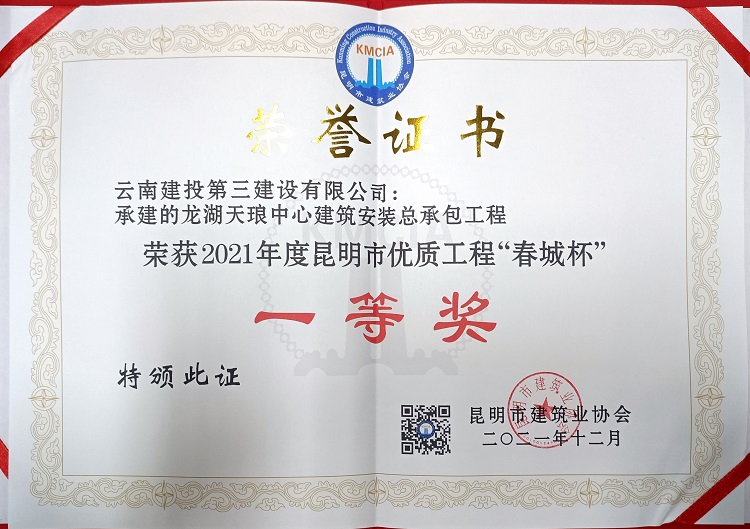 12月2日,由第一項目經(jīng)理部承建的龍湖天瑯中心建筑安裝總承包工程,榮獲昆明市2021年度昆明市優(yōu)質(zhì)工程“春城杯”一等獎。