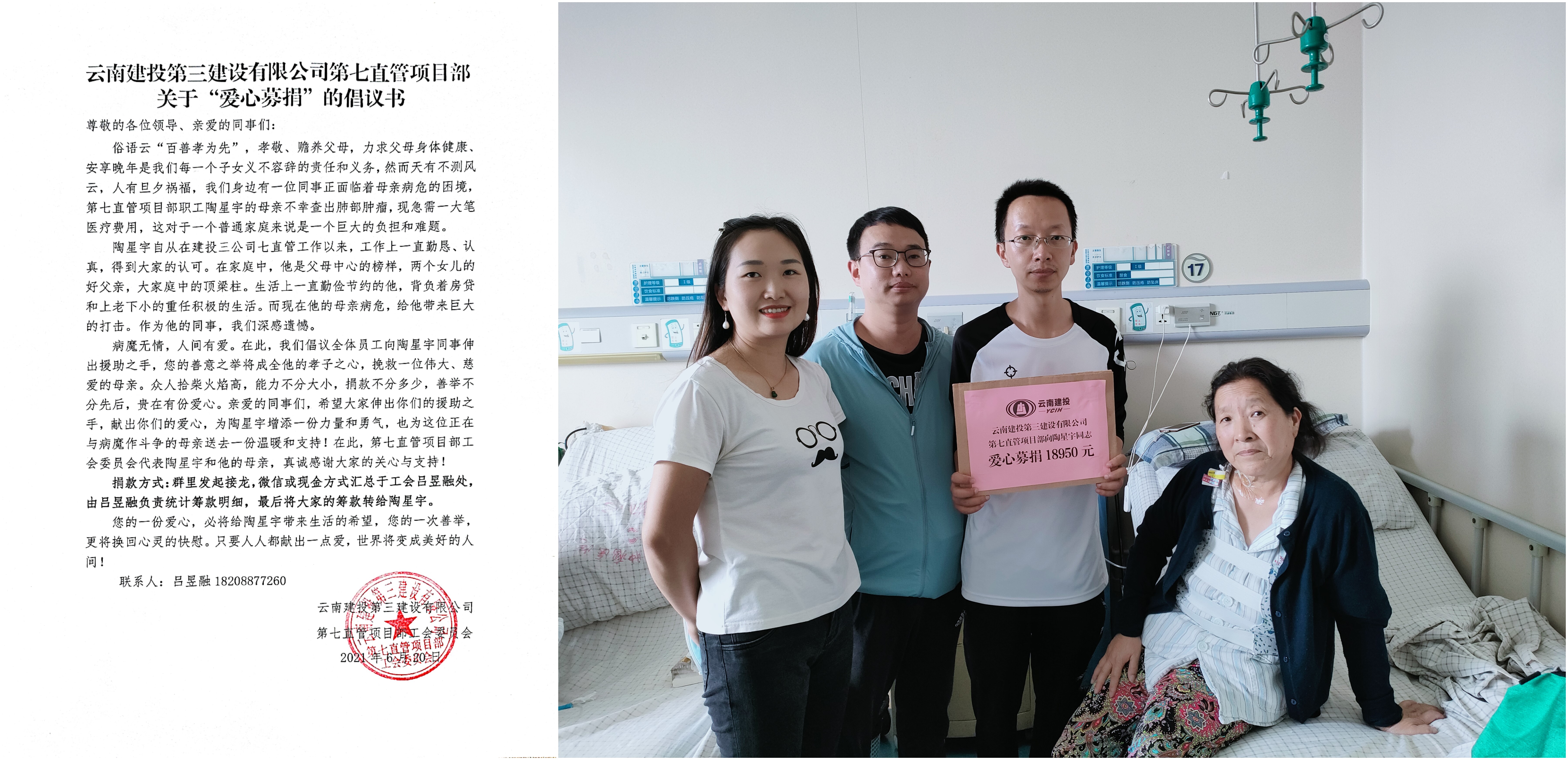 近日,公司第七直管項(xiàng)目部一名職工的母親被查出惡性腫瘤,急需大筆的醫(yī)療費(fèi)用,第七直管項(xiàng)目部黨支部、工會知情后,迅速發(fā)出募捐倡議,組織干部職工進(jìn)行愛心捐款。