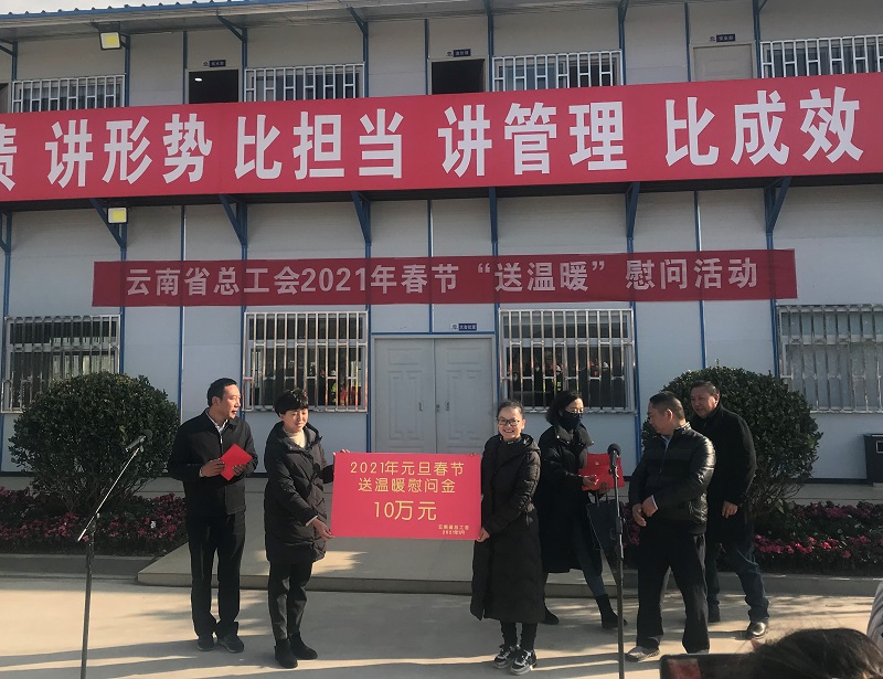 云南省總工會兼職副主席蔣秋香一行在深入了解項目基本情況后,給予項目建設較大的肯定和鼓勵,并為農(nóng)民工工友發(fā)們放了10萬元的慰問金,鼓勵大家在新的一年里迎難而上,做好疫情防控的同時竭力完成施工任務,叮囑大家在繁忙的工作中照顧好自己和家人。