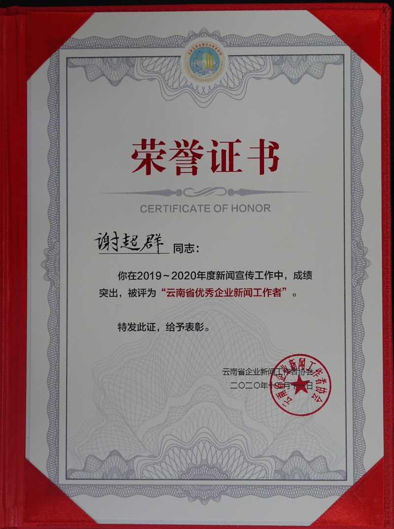 12月9日—11日,在玉溪市召開的“云南省企業(yè)新聞工作者協(xié)會2020年會暨紅塔文化講壇”中,公司微信公眾號“云南建投第三建設(shè)有限公司”榮獲“云南省優(yōu)秀企業(yè)新媒體”榮譽(yù)稱號,謝超群榮獲“2019-2020年度云南省優(yōu)秀企業(yè)新聞工作者”榮譽(yù)稱號。