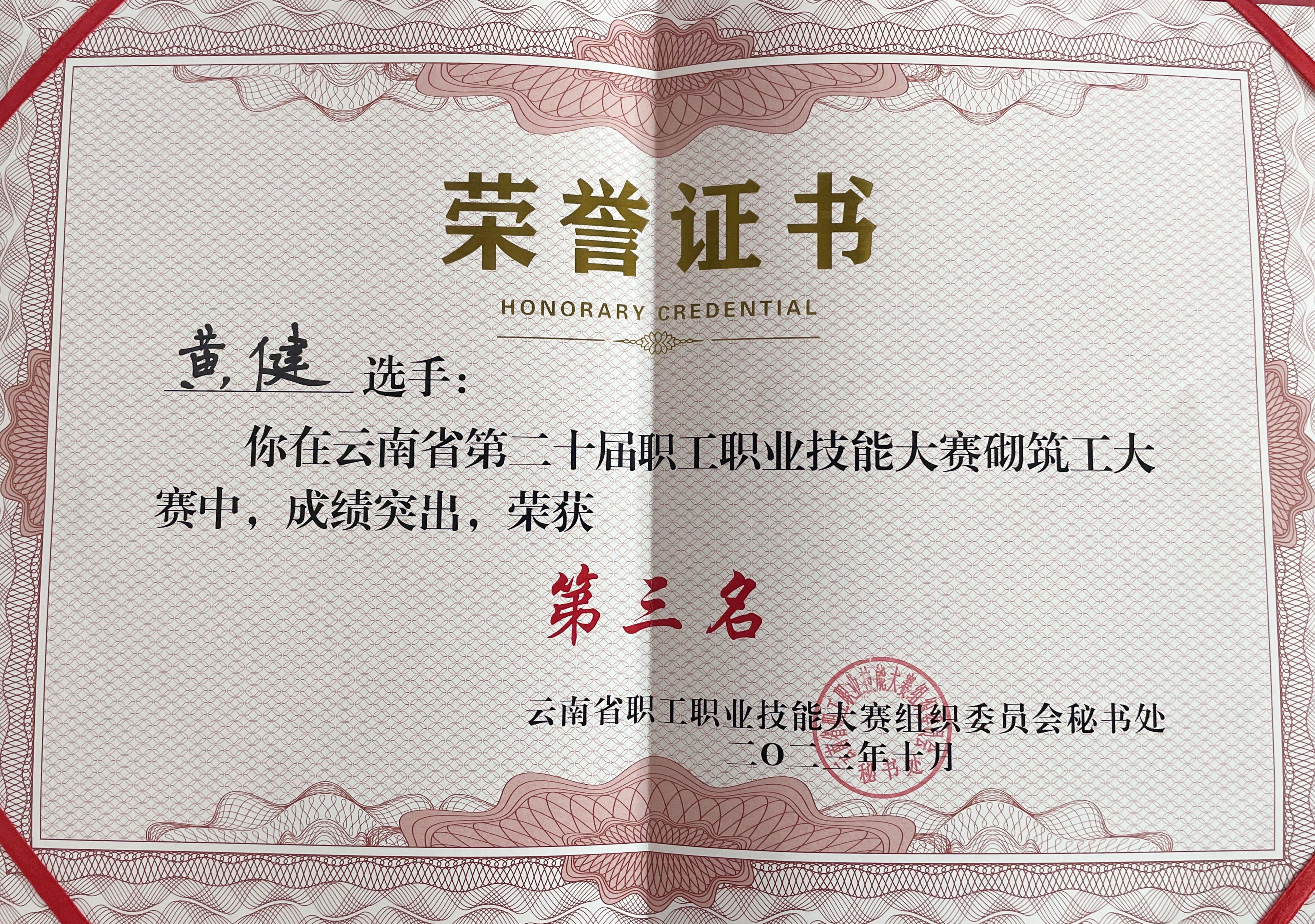近日,云南省第二十屆職工職業(yè)技能大賽砌筑工大賽圓滿落下帷幕,公司第十七直管項目部農(nóng)民工黃健榮獲大賽第三名。
