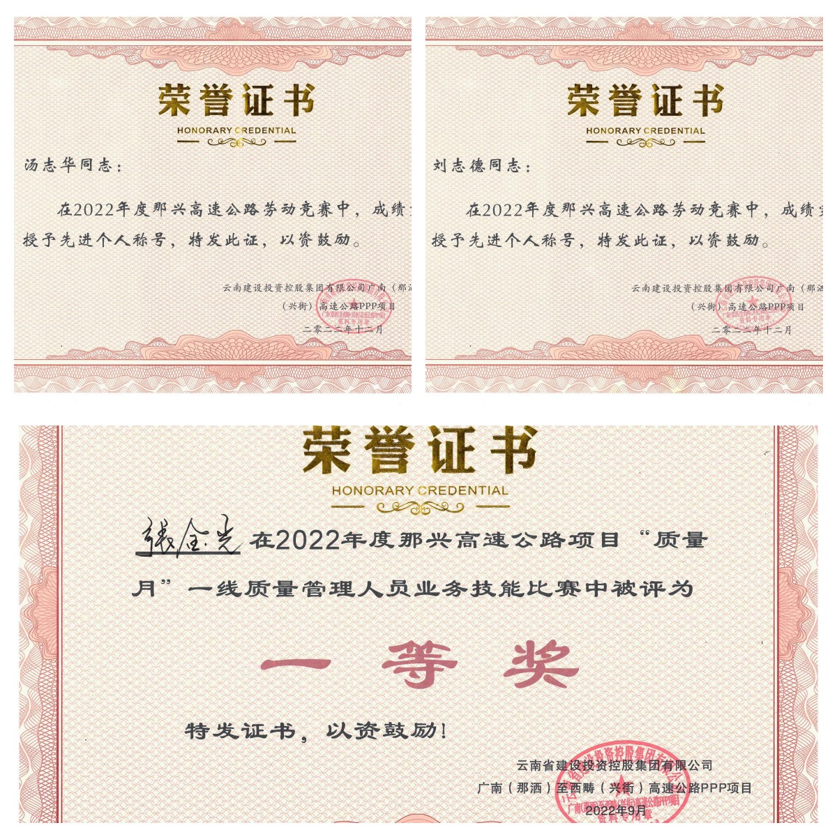 近日,在文山廣興高速公路投資建設(shè)開(kāi)發(fā)有限公司召開(kāi)的“2022年工作總結(jié)及先進(jìn)表彰大會(huì)”上,由公司路橋市政直管三部承建的那興高速公路土建六分部項(xiàng)目經(jīng)理部獲得“優(yōu)秀安全管理團(tuán)隊(duì)”稱號(hào),獲得項(xiàng)目公司50000元人民幣的獎(jiǎng)勵(lì)。同時(shí),項(xiàng)目副總工湯志華、安全總監(jiān)劉志德在2022年那興高速“能通全通”“互聯(lián)互通”工程勞動(dòng)競(jìng)賽中獲得“先進(jìn)個(gè)人”稱號(hào)。另外項(xiàng)目總工張金光在“質(zhì)量月”一線管理人員業(yè)務(wù)技能比賽中獲全線一等獎(jiǎng)。