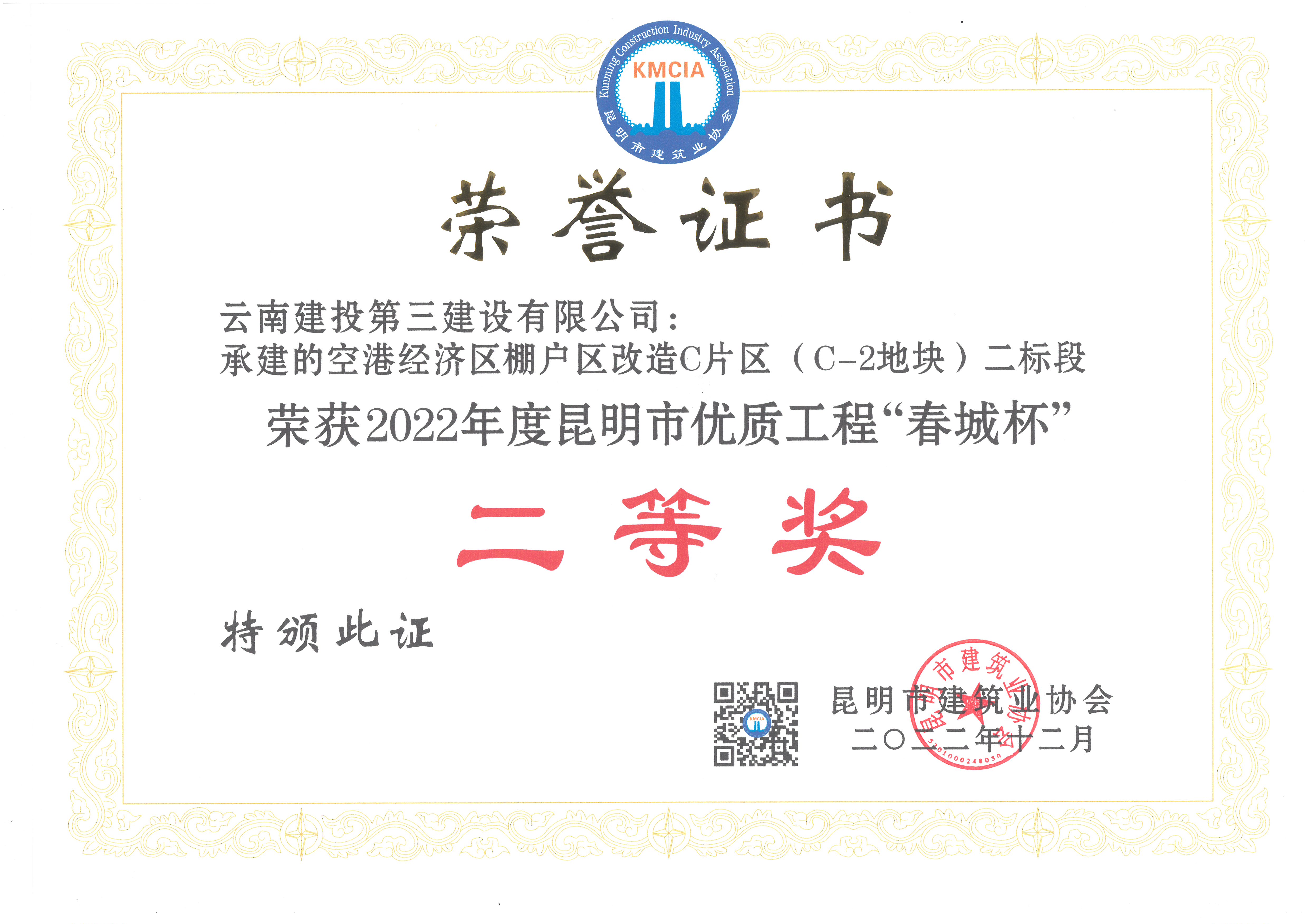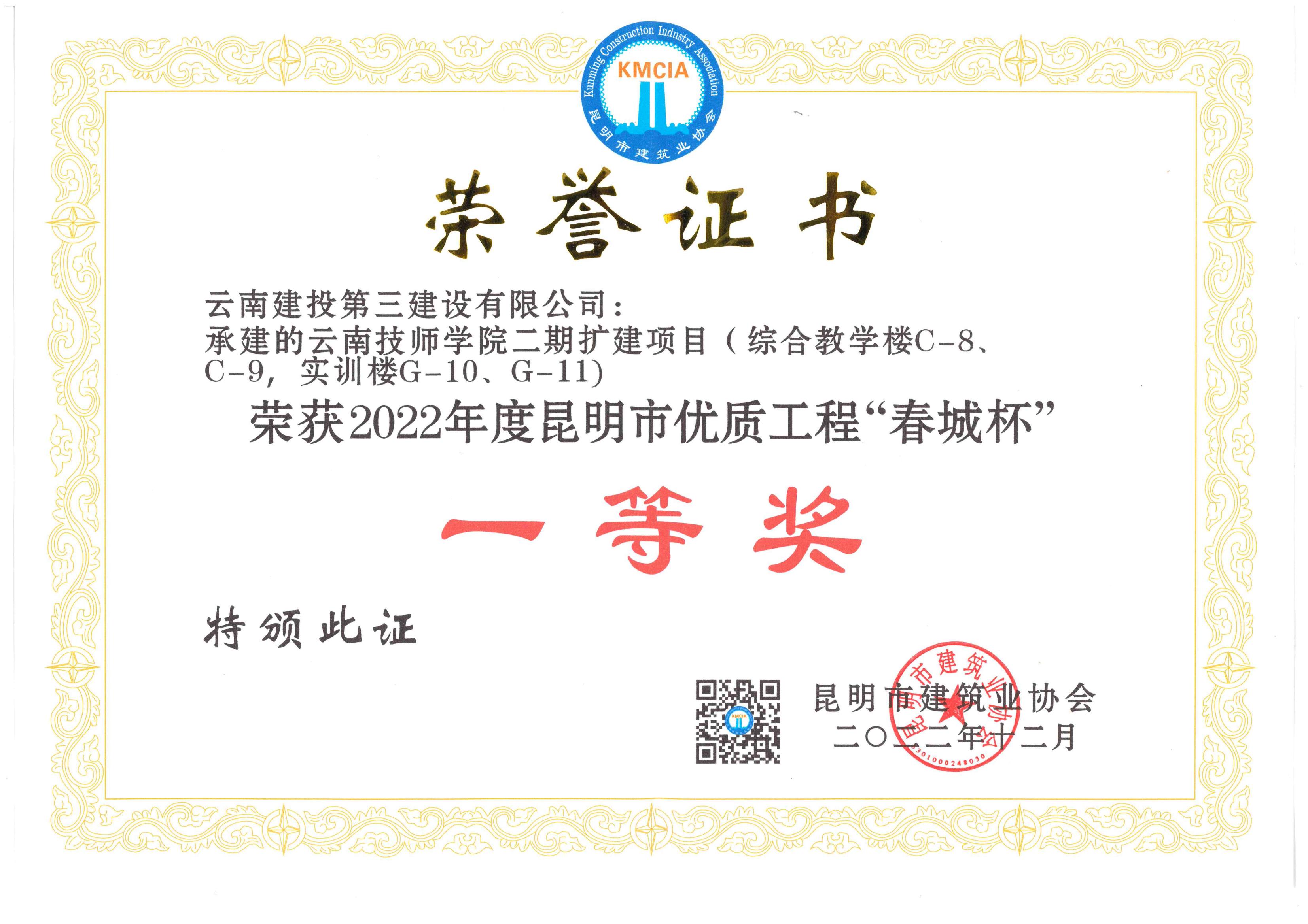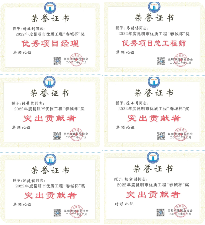 公司被評為2022年度昆明市建筑業(yè)“先進企業(yè)”和“質(zhì)量管理優(yōu)秀企業(yè)”,公司黨委書記、董事長彭云被評為2022年度昆明市建筑業(yè)“優(yōu)秀企業(yè)家”,公司技術(shù)質(zhì)量管理部沈雁波、朱家虎被評為2022年度昆明市工程建設(shè)行業(yè)“優(yōu)秀工作者”。公司已連續(xù)五年被評為昆明市建筑業(yè)“先進企業(yè)”和“質(zhì)量管理優(yōu)秀企業(yè)”。