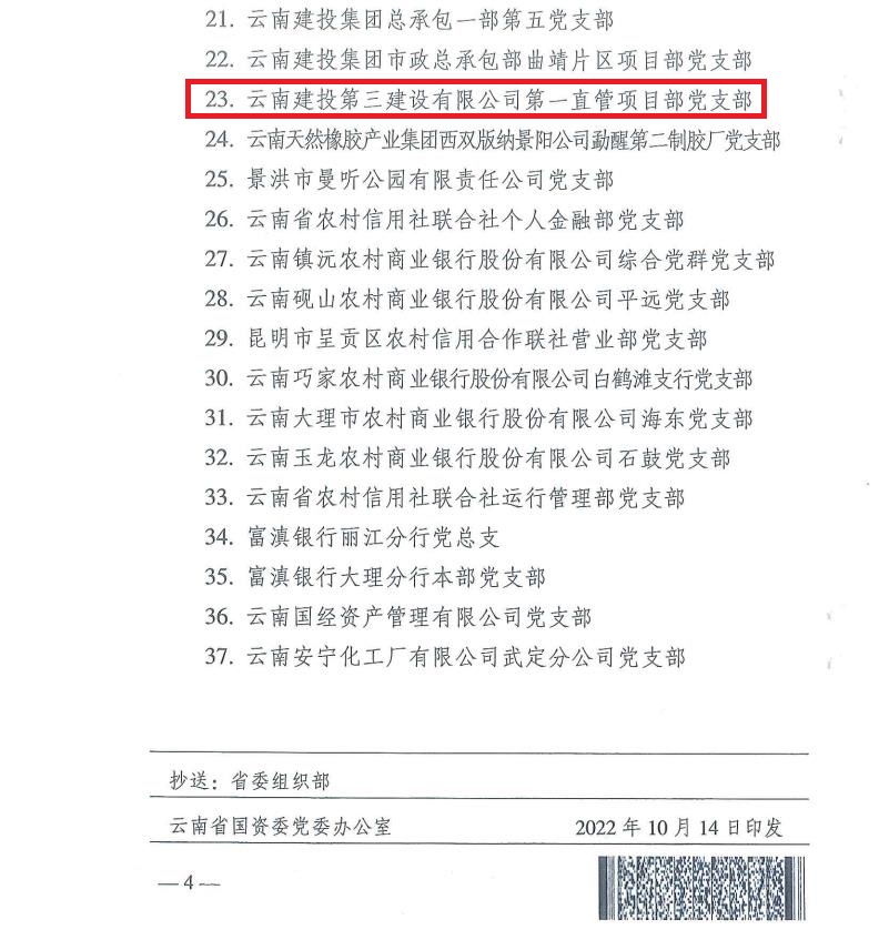 近日,按照云南省國資委黨委關(guān)于黨支部規(guī)范化建設達標創(chuàng)建工作部署,在逐級推薦、擇優(yōu)遴選的基礎上,公司第一直管項目部黨支部通過復核驗收,獲云南省國資委黨委命名的2021年度“規(guī)范化建設示范黨支部”榮譽。