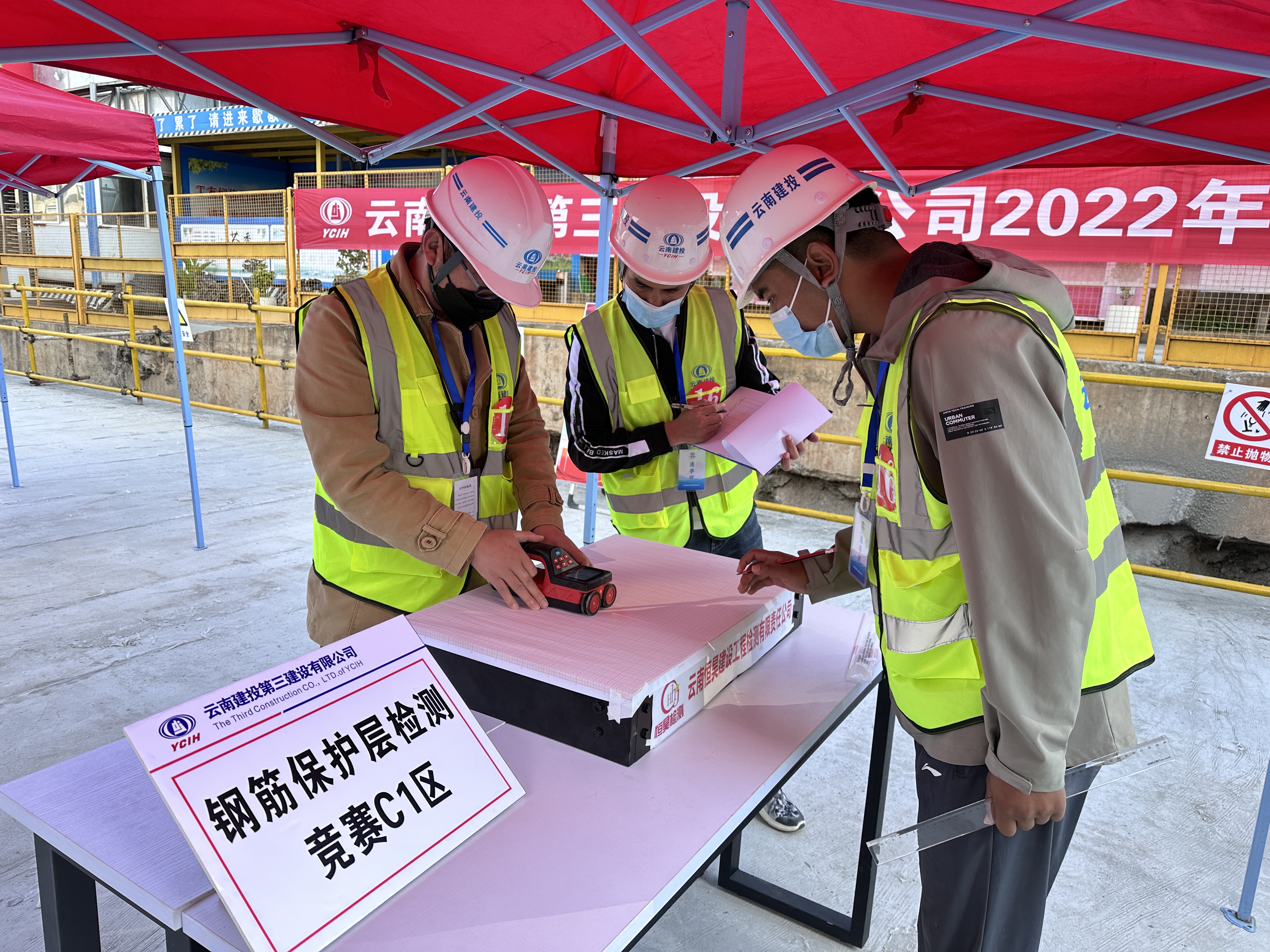本次競賽分為理論知識(shí)考試和實(shí)操項(xiàng)目兩部分,理論知識(shí)考試占比30%,實(shí)操項(xiàng)目占比70%。理論考試內(nèi)容出自:《回彈法檢測混凝土強(qiáng)度技術(shù)規(guī)程》《混凝土中鋼筋檢測技術(shù)標(biāo)準(zhǔn)》《鉆芯法檢測混凝土強(qiáng)度技術(shù)規(guī)程》《云南省建筑工程結(jié)構(gòu)實(shí)體檢測技術(shù)規(guī)程》《混凝土結(jié)構(gòu)施工質(zhì)量驗(yàn)收規(guī)范》。實(shí)操項(xiàng)目分為鋼筋保護(hù)層厚度及鋼筋橫向間距測定、樓板厚度測定、回彈法檢測混凝土抗壓強(qiáng)度。本次競賽考察選手理論知識(shí)、儀器操作、數(shù)據(jù)計(jì)算的綜合能力及測量管理規(guī)范化工作,真實(shí)反映當(dāng)前公司測量人員的技能水平,為公司下一步技能人才培養(yǎng)提供了重要參考。