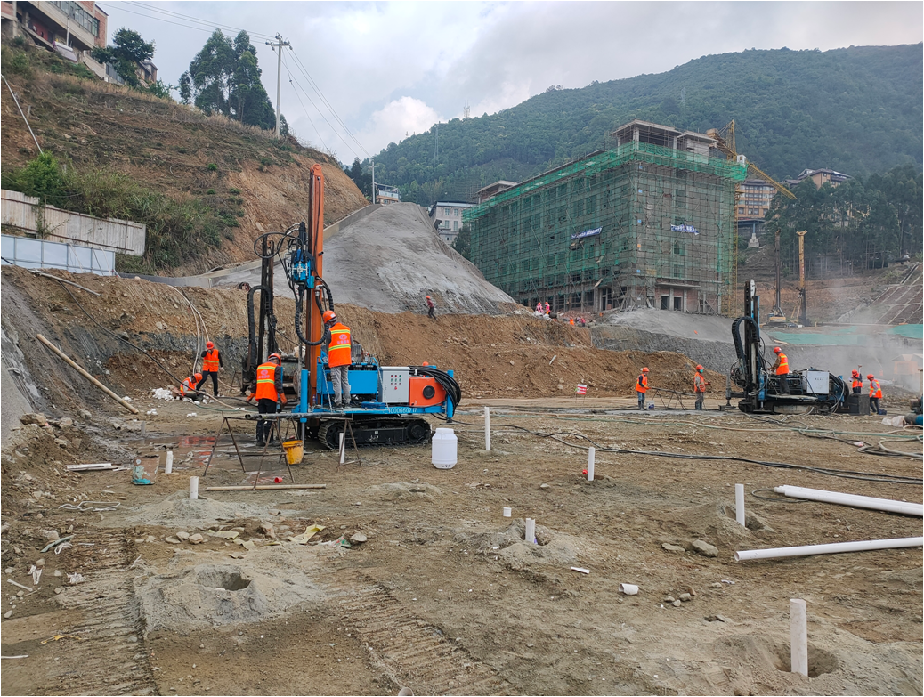 順利完成基坑土方開挖和邊坡支護后,還來不及高興,又一個新的難點挑戰(zhàn)擺在了項目管理人員面前,由于綠春人民醫(yī)院遷建地址以前是一處峽谷地形,地基土為填土深度超40m的欠固結(jié)土,固結(jié)時間僅為8年,未經(jīng)加固處理的填土地基后期沉降會對樁基造成負(fù)摩擦力影響,使樁基礎(chǔ)加速沉降,對建好的建筑危害極大。為此,直管部緊急聯(lián)合設(shè)計單位、勘察單位的專家們共同商議,從強夯法到高壓旋噴注漿法,先后組織五方責(zé)任主體召開項目協(xié)調(diào)會、專家咨詢會、專題會7次。前期進行了“夯擊成孔—孔內(nèi)分段夯實碎石樁”工藝試驗,但是對周圍的震動影響太大,后期確定采用“高壓旋噴注漿”工藝對填土地基進行處理,切實解決了工程項目填土沉降的問題。