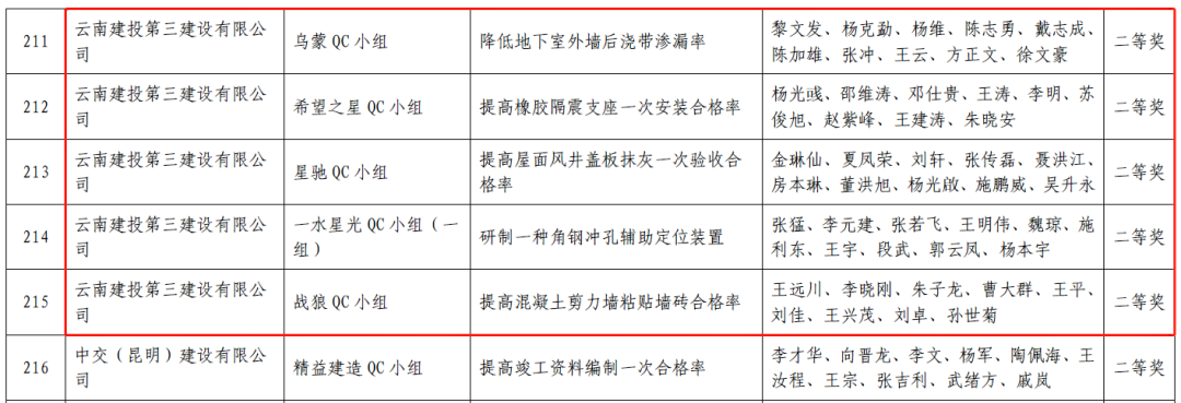 其中,榮獲中國(guó)建筑協(xié)會(huì)優(yōu)秀QC成果1項(xiàng)(二等獎(jiǎng)1項(xiàng))、榮獲云南省建筑業(yè)協(xié)會(huì)優(yōu)秀QC成果16項(xiàng)(一等獎(jiǎng)2項(xiàng)、二等獎(jiǎng)14項(xiàng))、榮獲云南省市政工程協(xié)會(huì)優(yōu)秀QC成果1項(xiàng)(二等獎(jiǎng)1項(xiàng))。