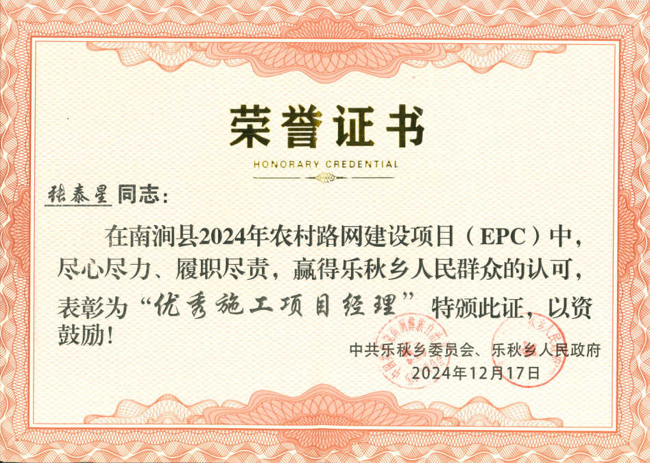 12月17日,大理州南澗縣交通局、樂秋鄉(xiāng)政府為公司南澗縣2024年農(nóng)村路網(wǎng)建設(shè)項目(EPC)送來一幅錦旗,并為兩名職工頒發(fā)榮譽證書。