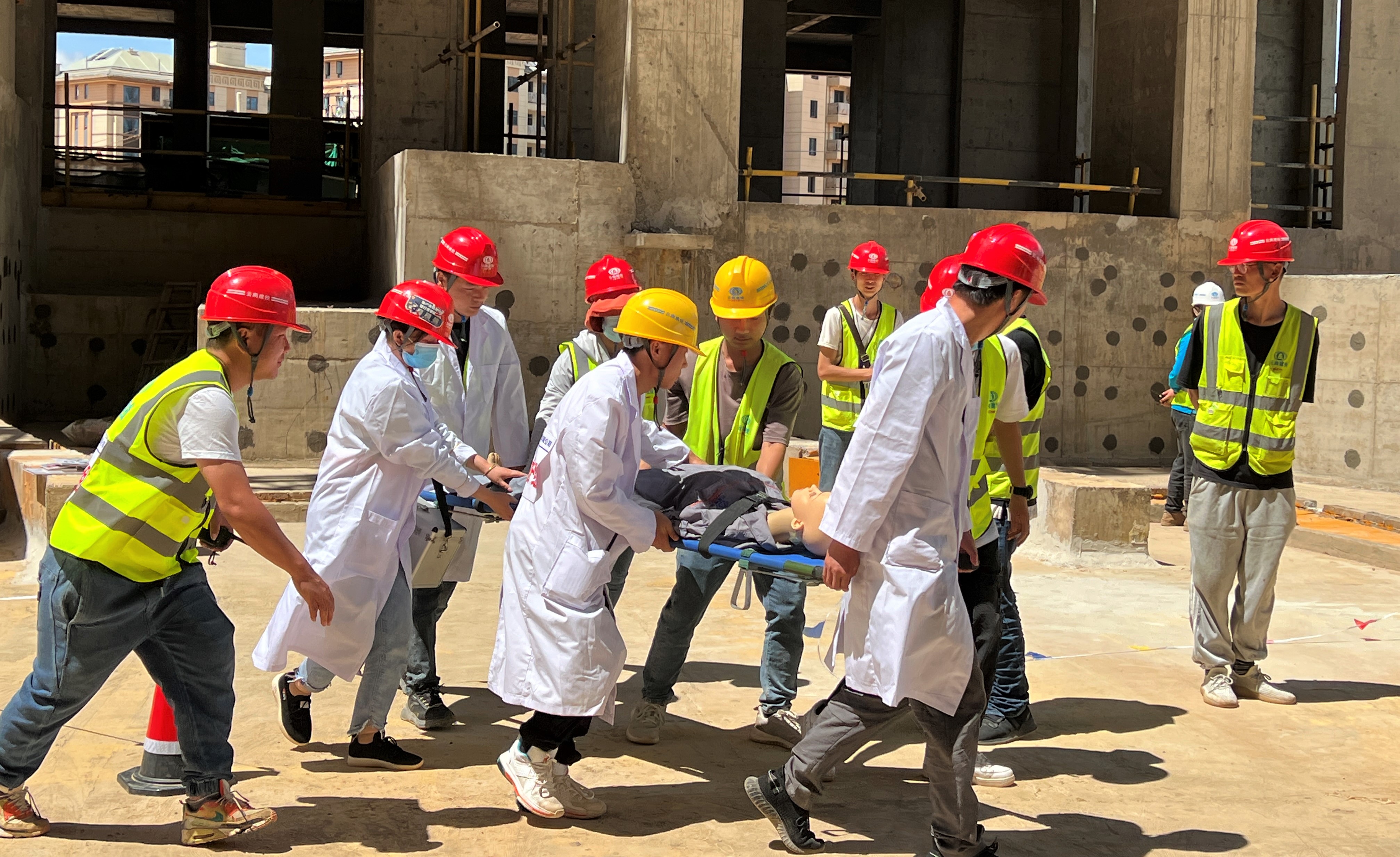 本次演練分為應(yīng)急搶險組、醫(yī)療救護組、物資保障組、事故調(diào)查組等8個小組,施工人員私自翻越欄桿作業(yè),導(dǎo)致高處墜落,現(xiàn)場人員發(fā)現(xiàn)之后,立即報告項目負責人,由項目負責人向公司報告事故并啟動應(yīng)急救援預(yù)案,各小組迅速出動,應(yīng)急搶險組確定事故發(fā)生地點,并拉設(shè)警戒線;技術(shù)組緊接著對事故周邊進行監(jiān)測和評估,確認事故現(xiàn)場沒有二次傷害風險;醫(yī)療救護組攜帶醫(yī)用急救箱、擔架進入現(xiàn)場,對傷員進行初步檢查,對傷者傷勢進行初步判斷,發(fā)現(xiàn)傷者意識模糊,身體多處受損,在進行心肺復(fù)蘇和人工呼吸后,傷者意識稍微清醒,醫(yī)護人員進行簡單處理后,迅速聯(lián)系救護車將其送往醫(yī)院進一步檢查治療。各小組陸續(xù)撤離現(xiàn)場,相關(guān)小組成員在事故現(xiàn)場設(shè)置警戒線,等待繼續(xù)查明事故原因、確定事故性質(zhì)和責任等工作。至此,應(yīng)急演練圓滿結(jié)束。